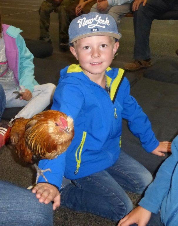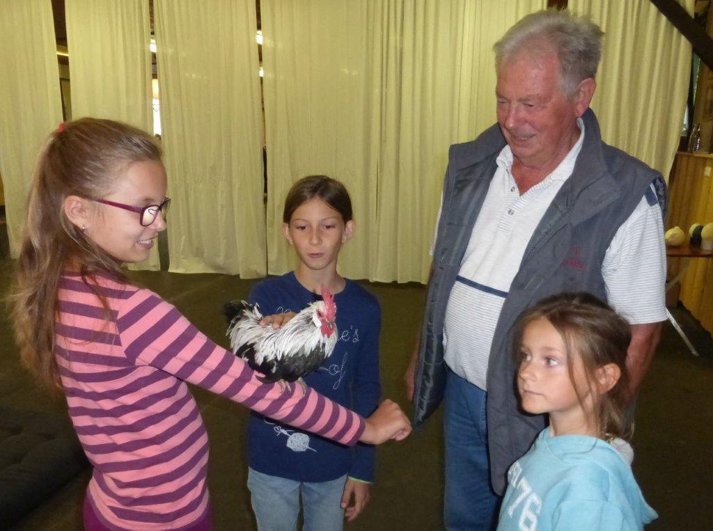 Dann ging man gestärkt zum versprochenen Programm über. Natürlich, wie könnte es anders sein, stehen hier Tiere und insbesondere Rassegeflügel im Mittelpunkt des Geschehens. Zuerst komme aber das Ei. Eine Eierschau vom Zwergwachtelei bis zum Straußenei, mit Raterunde, welches Huhn oder welche Taube denn aus diesem oder jenem Ei schlüpfen könnte, entpuppte sich als sehr unterhaltsam aber auch lehrreich,. Fabian Köstler, Josef Müller und Klaus Wollenhaupt zeigten den Kid’s die Hühner.