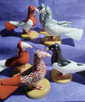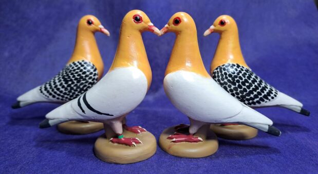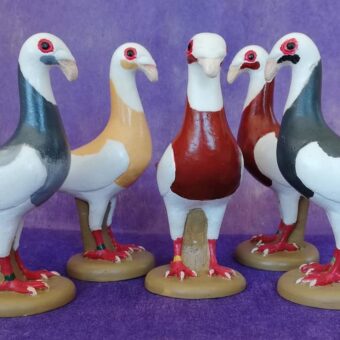In Südafrika haben wir früher Medaillen auf Taubenausstellungen verliehen. Bei einem Clubtreffen im Jahr 2009 schlug jemand vor, alternative Auszeichnungen für unsere regionalen Ausstellungen in Betracht zu ziehen. Der verstorbene Stewart Patterson zeigte uns winzige Figuren, die er aus England mitgebracht hatte. Da ich mit künstlerischen Fähigkeiten gesegnet bin, versprach ich, mir eine Idee auszudenken. Ich recherchierte über Modell- und Formenbau und fand einen lokalen Materiallieferanten. Nach einigen Experimenten erblickte die erste halbdreidimensionale Figur mit flacher Rückseite das Licht der Welt. Aufgrund ihrer unverwechselbaren Merkmale war dies ein Marchenero-Kropfvogel. Im Vergleich zu dem, was ich derzeit anbiete, war dieses Modell schrecklich. Die Füße sahen eher nach Papagei als nach Taube aus!