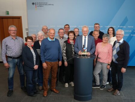 Alois Rainer zog 2013 für den Wahlkreis Straubing/Regen in den Bundestag ein, zuvor war er 18 Jahre Bürgermeister seiner Heimatgemeinde Haibach. Sein politisches Wirken war stets von Pragmatismus und Durchsetzungsvermögen geprägt. So war er bereits ab dem Jahre 2018 in verschiedenen Ausschüssen vertreten, von 2018 bis 2024 war er Vorsitzender des Finanzausschusses. Mit dem Regierungswechsel im letzten Jahr sollte das Landwirtschaftsministerium wieder in den Süden der Republik gehen und „schwarz“ werden und so ist die Wahl auf Alois Rainer, dem „schwarzen Metzgermeister aus Haibach“, wie ihn der Bayerische Ministerpräsident anfangs bezeichnete, gefallen. Eine sehr gute Wahl, denn Alois Rainer ist volksnah, er weiß von den Nöten und Sorgen der Leute. Dies stellte sich auch beim dem lockeren Informationsgespräch mit ihm wieder deutlich heraus. Götz Ziaja, unser VDT-Vorsitzender, wohnhaft und arbeitend in Berlin, ist zu unserer Gruppe hinzugestoßen und er trug unsere Situation, momentan verschärft durch die ND-Auftritte, vor. Minister Rainer gab die Auskunft, dass sich derzeit das dem Ministerium unterstellte FLI mit der Materie beschäftige. Als Gastgeschenk unserer Gruppe und im Namen unseres Vereins übergab ich eine Deutsche Modeneser Figur, bemalt von Josef Hanauer, in den Deutschlandfarben, also Kopf und Hals in Schwarz, Körper in Rot und die Läufe in Gold. Das Flügelschild in Weiß/Blau gewolkt, also den Farben des Bayerischen Himmels.